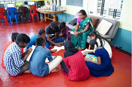 First generation learners from economically backward communities are often shy and introverted. We conduct various workshops that include role play, games, read alouds, and storytelling to help create a safe space for children to express themselves and step out of their comfort zone. We help them overcome their stage fright, find their voice, and hold their own.